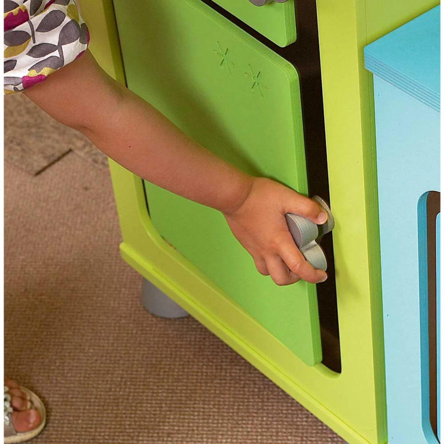 Sa porte anti-pince doigts est spécialement étudiée pour éviter aux enfants de se coincer les doigts lors de leurs jeux.