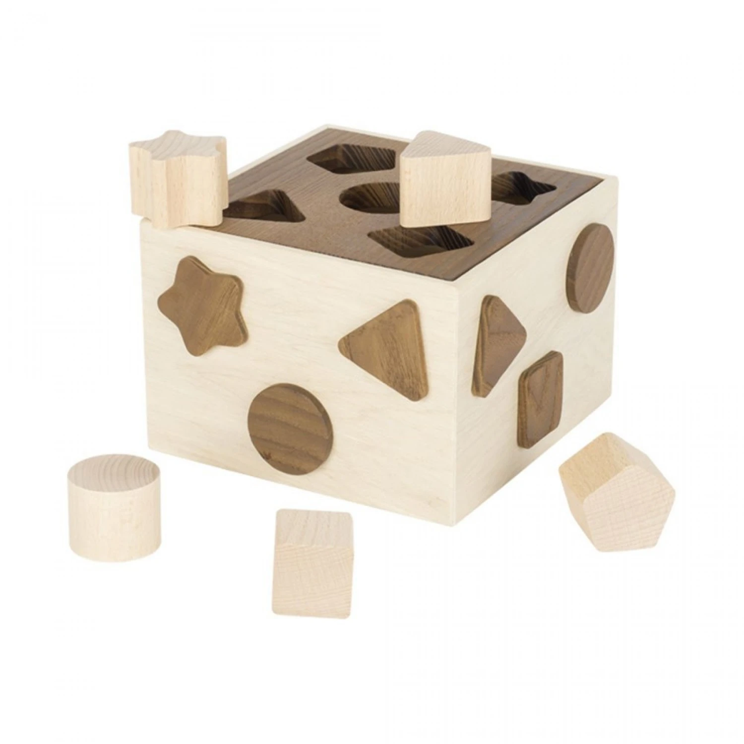 Cette boîte contient 5 formes différentes en bois. Le couvercle est amovible pour permettre le retrait des éléments.