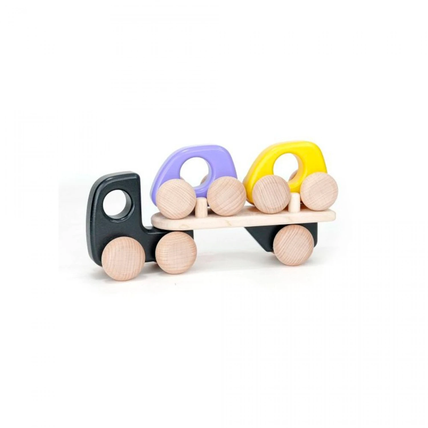 Un camion transportant 2 véhicules très faciles à prendre en main grâce aux formes arrondies. Ces véhicules sont colorés avec des peintures à base de composants naturels. Les deux petites voitures sont utilisables indépendamment. Véhicules en bois massif.