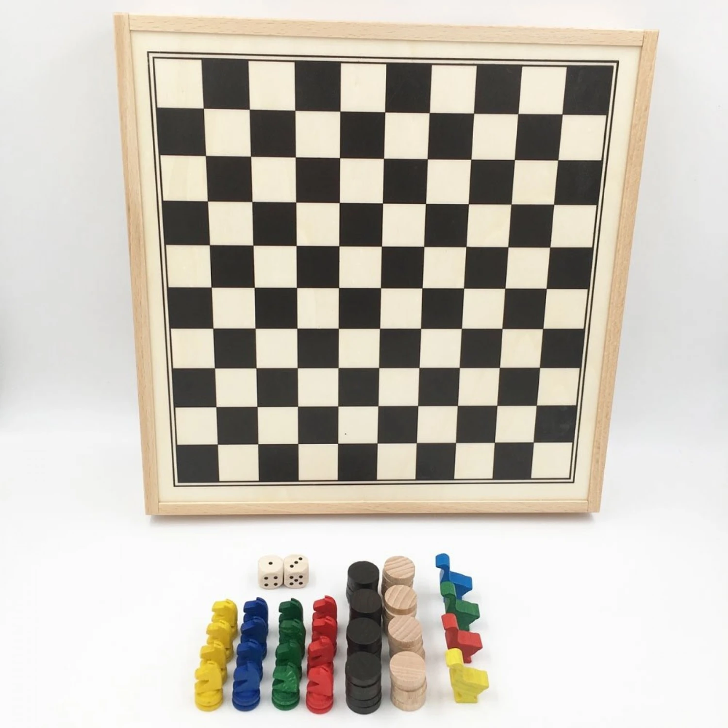 Un coffret de jeux en bois traditionnels contenant 4 jeux : Le jeu de l’oie, les petits chevaux, les dames et la marelle. Les jetons en bois se rangent dans le coffret de jeux.