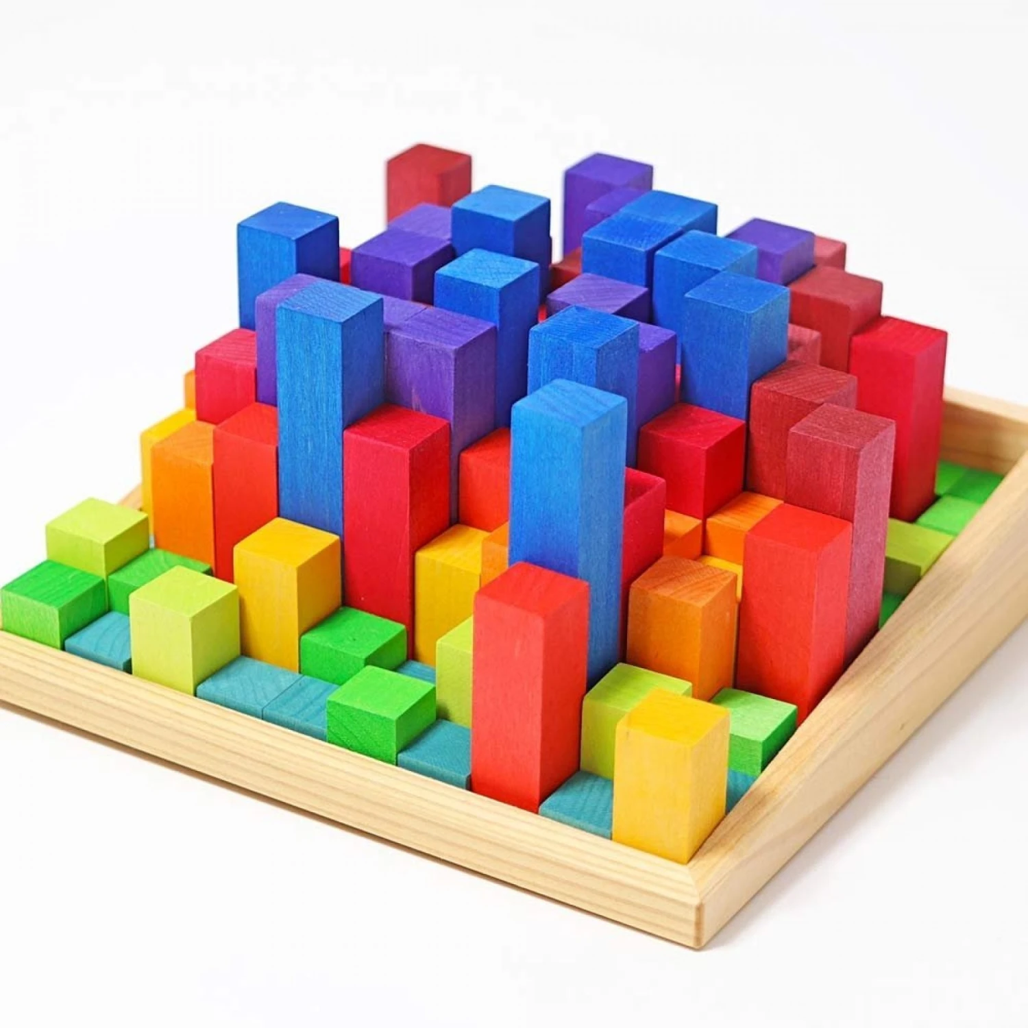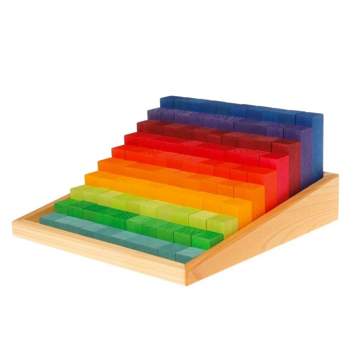 Cet escalier de comptage comprend 100 cubes en bois de tailles et de couleurs différentes mesurant de 1 à 10 cm de hauteur et 2 cm de largeur. Pour aborder les notions mathématiques : addition, fraction, soustraction….