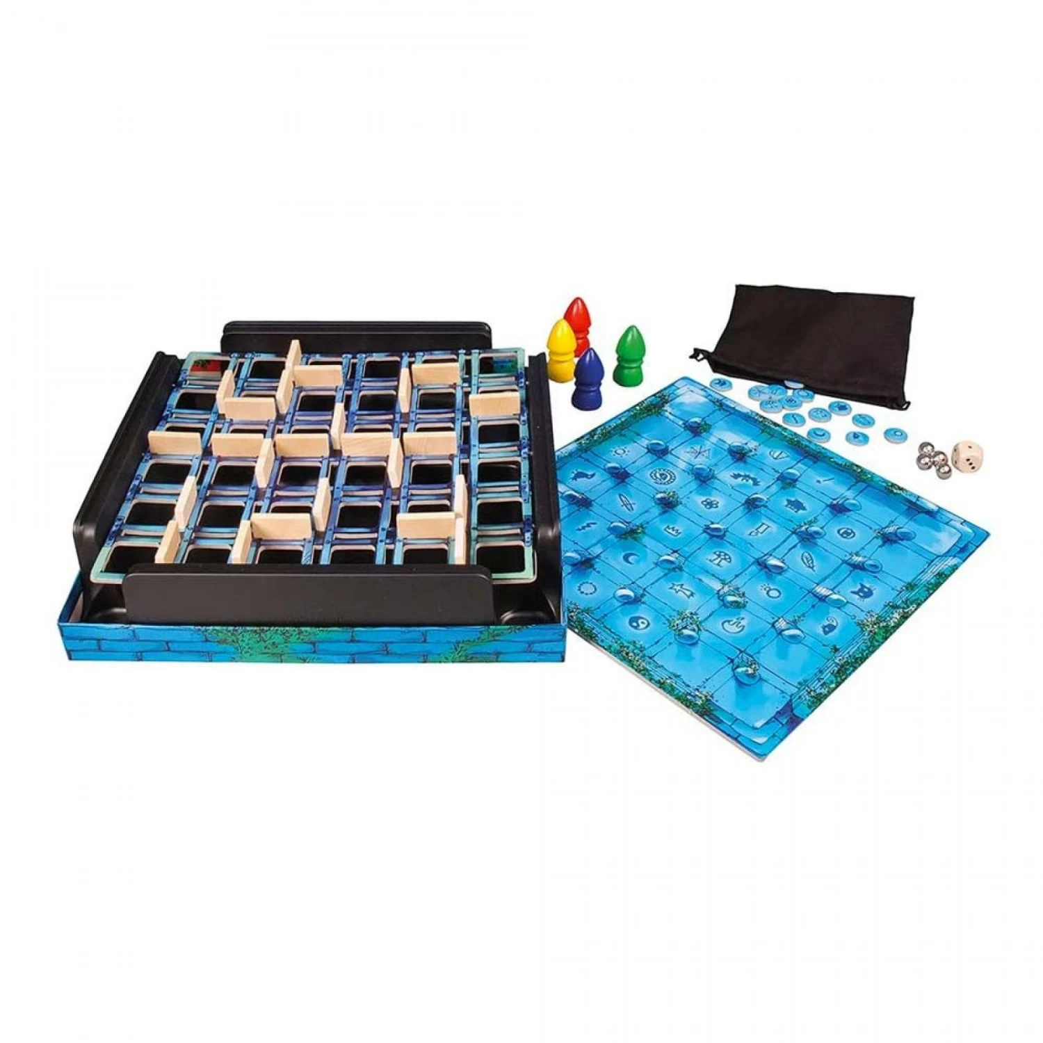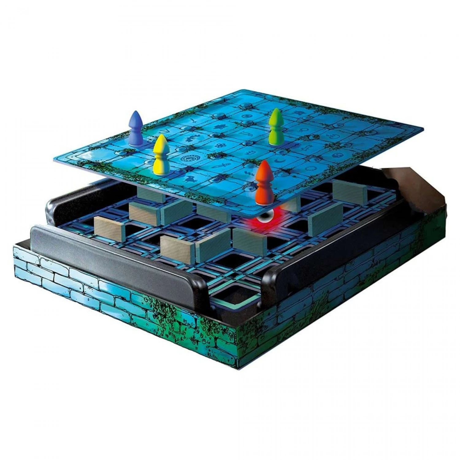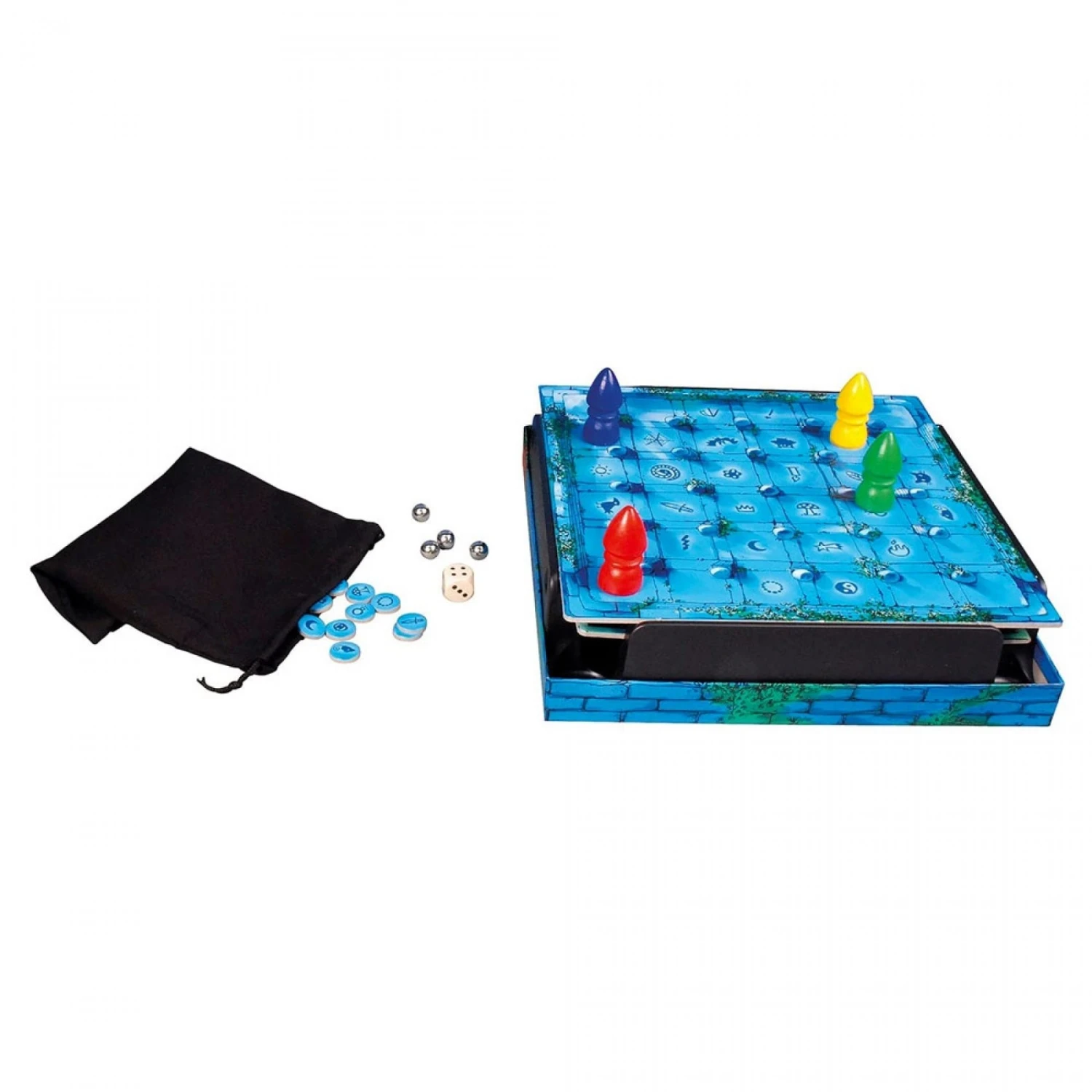 Règle du jeu : Pour commencer, placez les murs du labyrinthe puis essayez de mémoriser le parcours qui est ensuite recouvert par le plateau de jeu. Chaque joueur choisit un magicien et le place à un angle du plateau. Puis, il glisse une bille métallique sous le plateau qui vient se fixer à son pion. Le premier joueur lance le dé et déplace son magicien. S’il arrive sur la case où se trouve le jeton objet, il gagne cet objet et on place un nouveau jeton. Mais si un magicien se cogne contre un mur invisible, sa bille tombe et il devra recommencer le parcours.