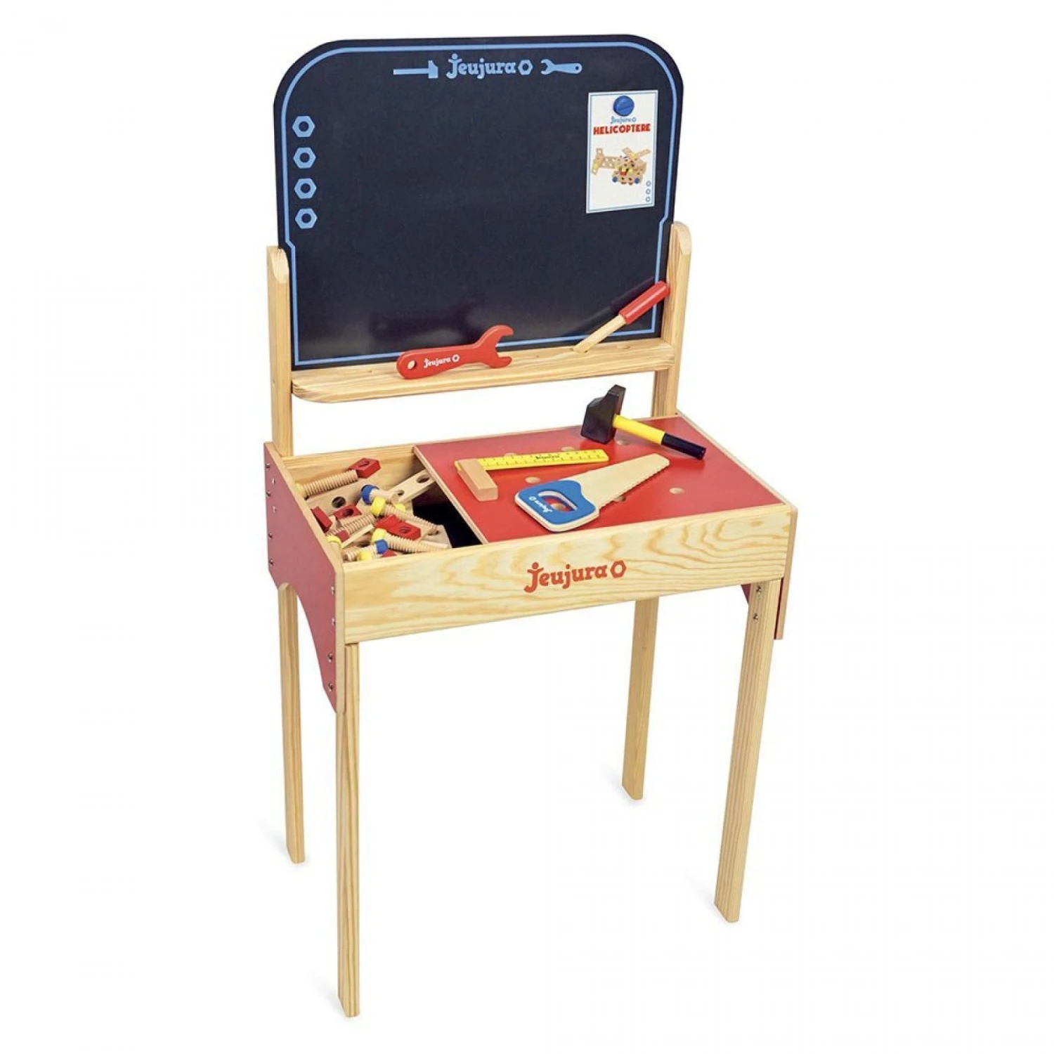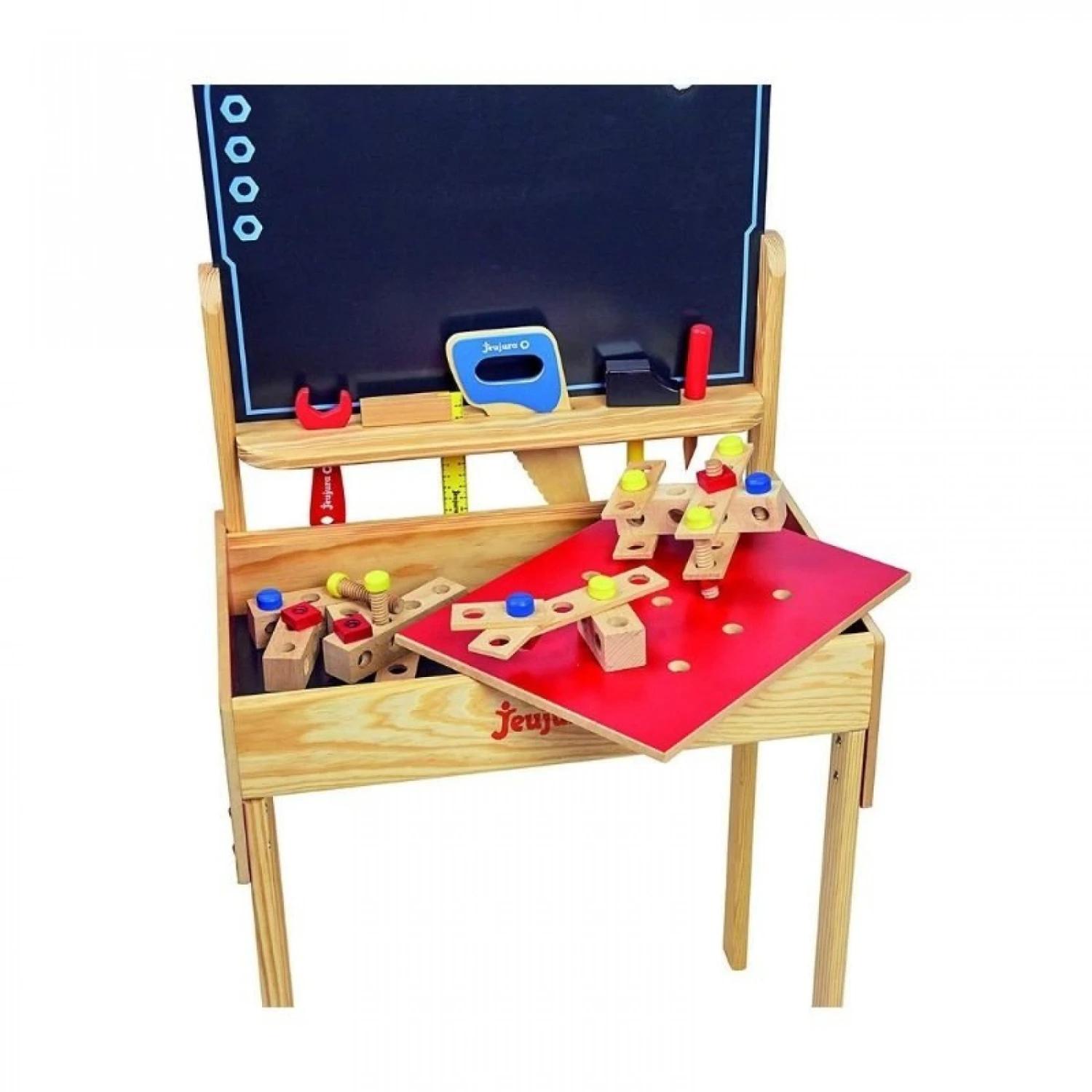 Cet établi en bois est très fonctionnel, il permet de s’amuser à réaliser des constructions grâce aux nombreux outils et ses 9 modèles inclus. Il possède un grand coffre de rangement et une ardoise réversible (côté feutre et côté ardoise). Le kit de bricolage de 39 pièces est en bois : marteau, scie, tournevis, clé, équerre avec un kit de bricolage (pièces et plaques perforées, vis et écrous).