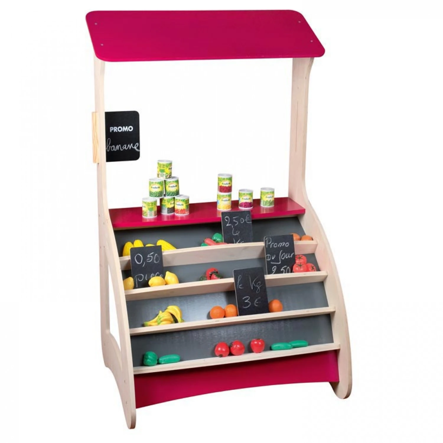 Une marchande en bois de grande taille pour imiter les commerçants et leurs clients. Il ne reste qu’à garnir les rayons de fruits et légumes pour les vendre.
