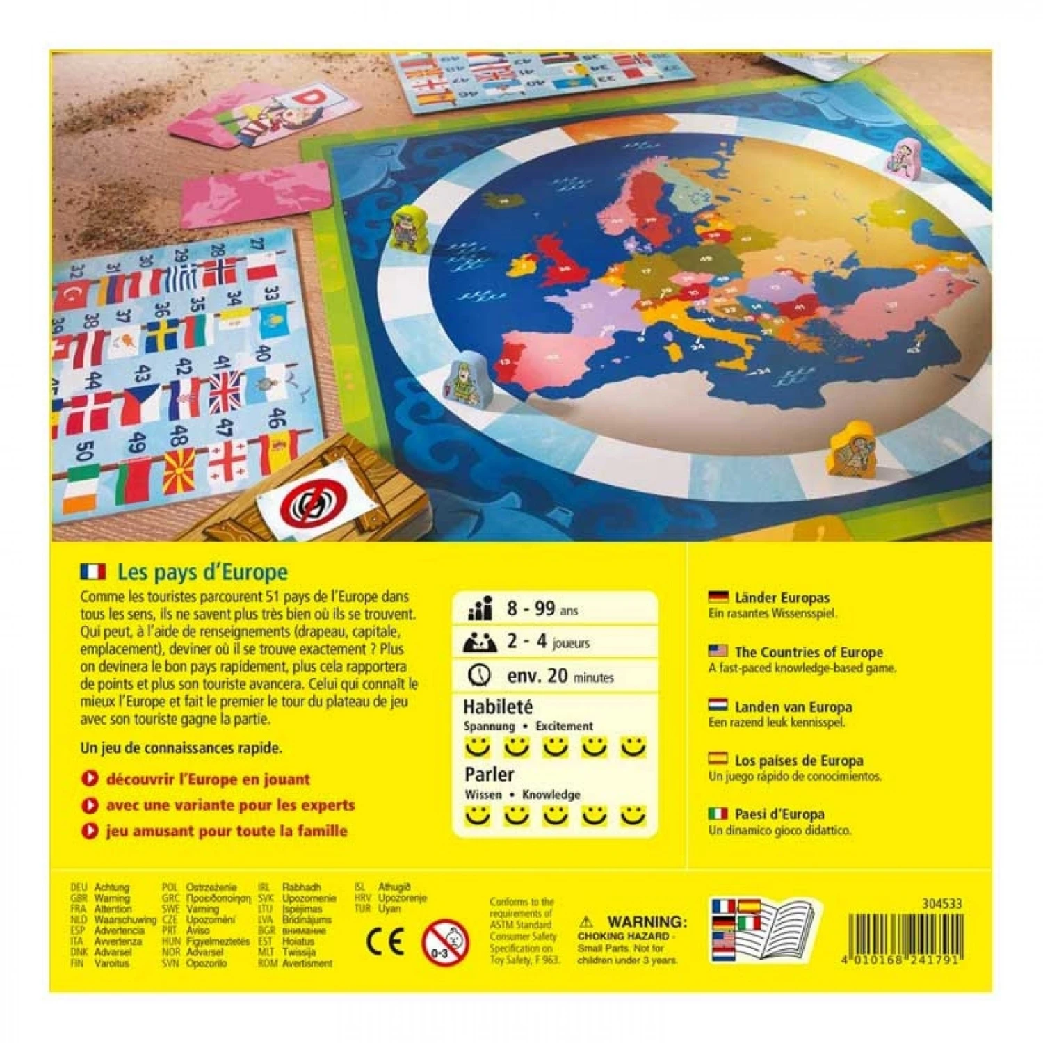 41 touristes parcourent les 51 pays d’Europe dans tous les sens. Ils sont un peu perdus et ont besoin d’aide afin de s’orienter. Devine rapidement le pays et avance sur le plateau de jeu à l’aide des indices. Le joueur qui connaît le mieux l’Europe et fait le tour du plateau de jeu avec son touriste le plus rapidement possible remporte la partie.