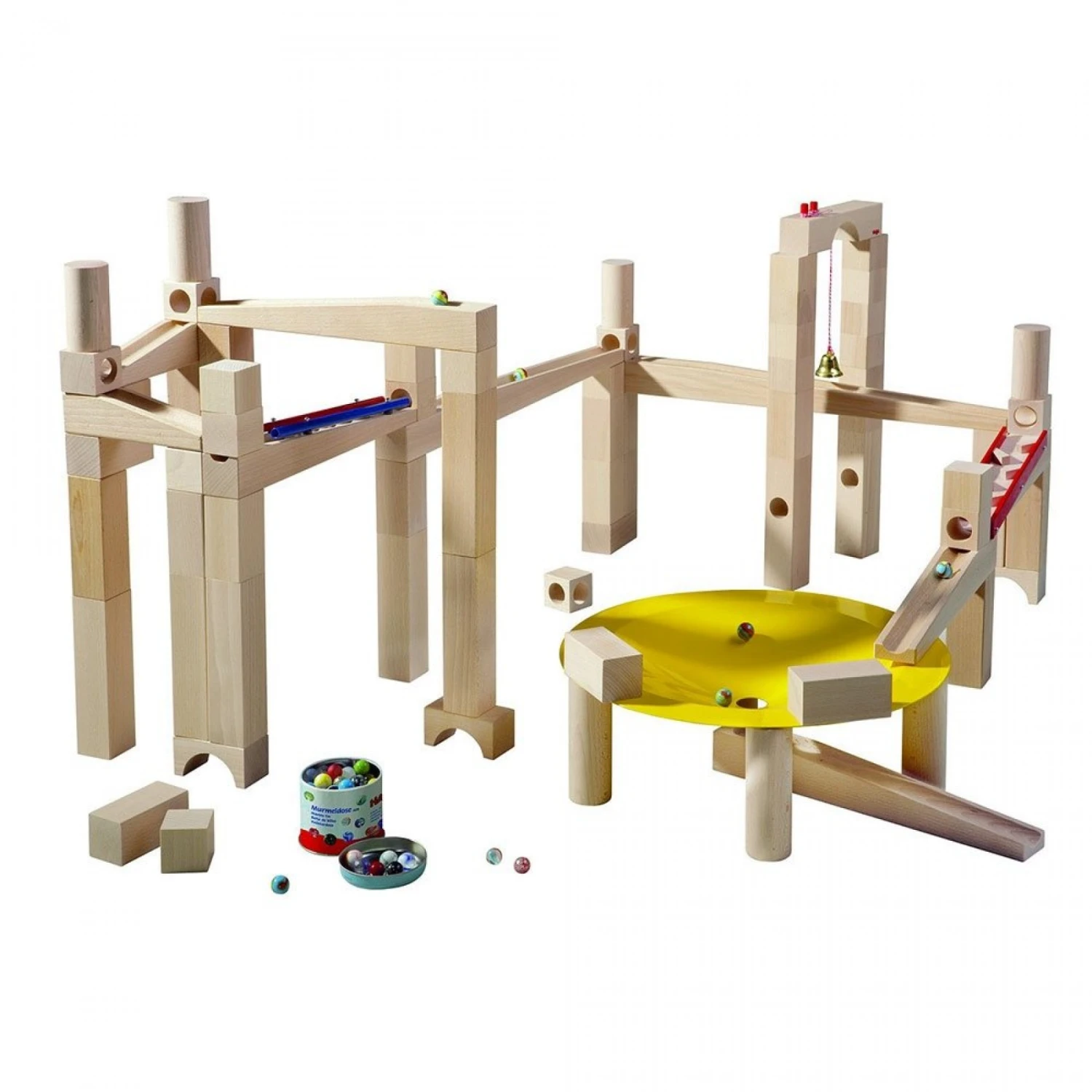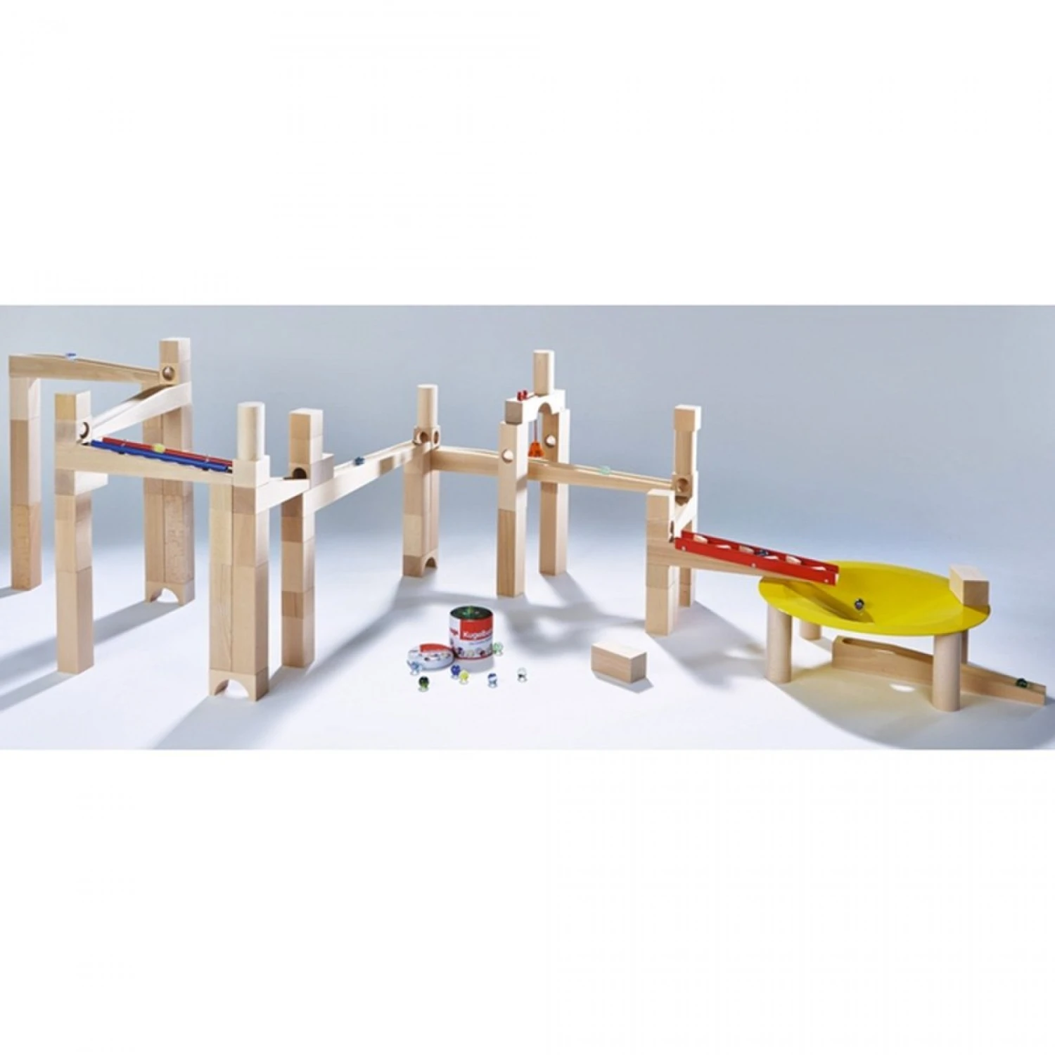 Un toboggan à billes très complet, permettant de nombreuses possibilités de parcours. Ce coffret « géant » contient de nombreux blocs en bois de hêtre massif ainsi que des billes en verre.
