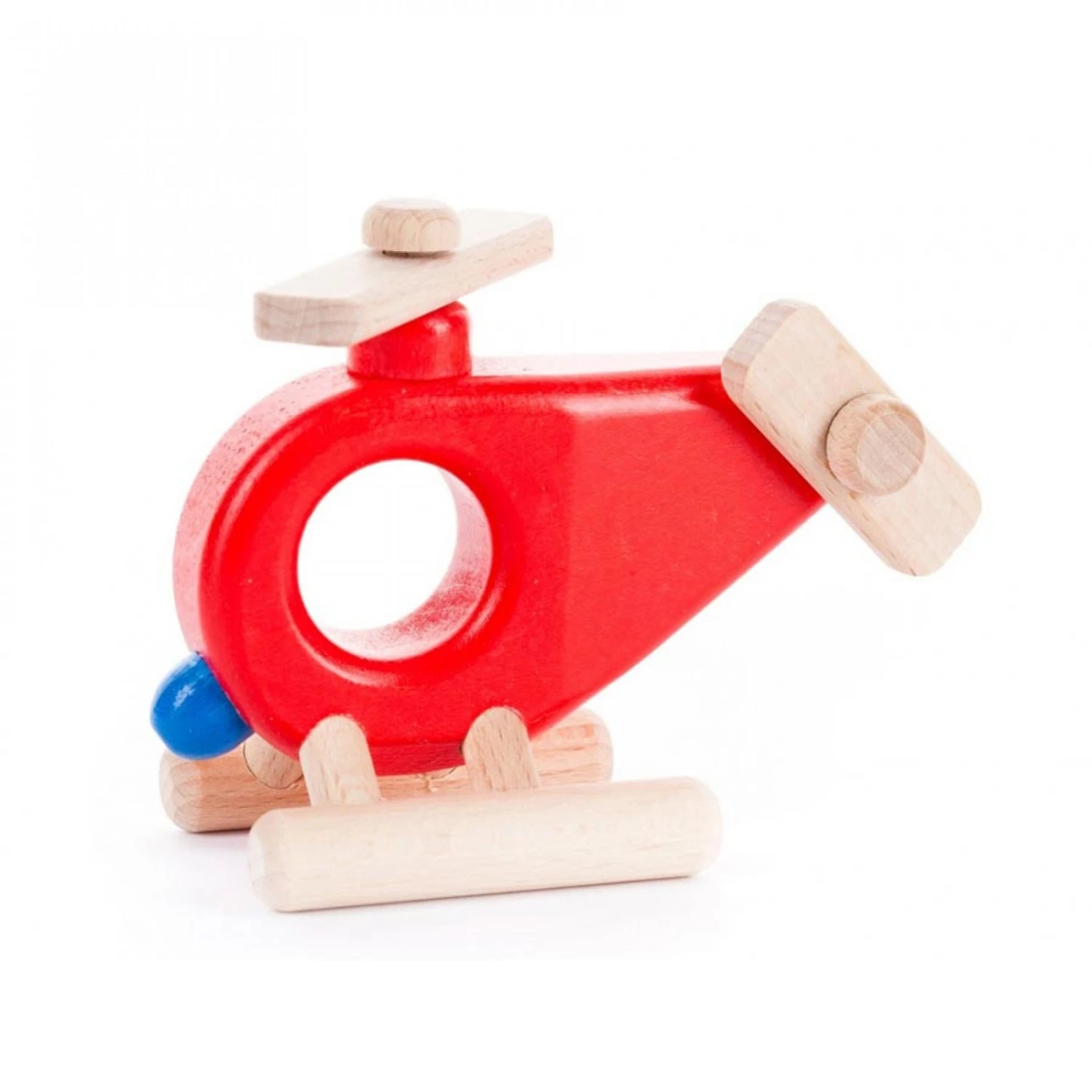 Un hélicoptère en bois aux belles formes arrondies, prêt à décoller. Cet hélicoptère affrété par les pompiers arrivera rapidement sur place pour remplir sa mission et éteindre l’incendie.