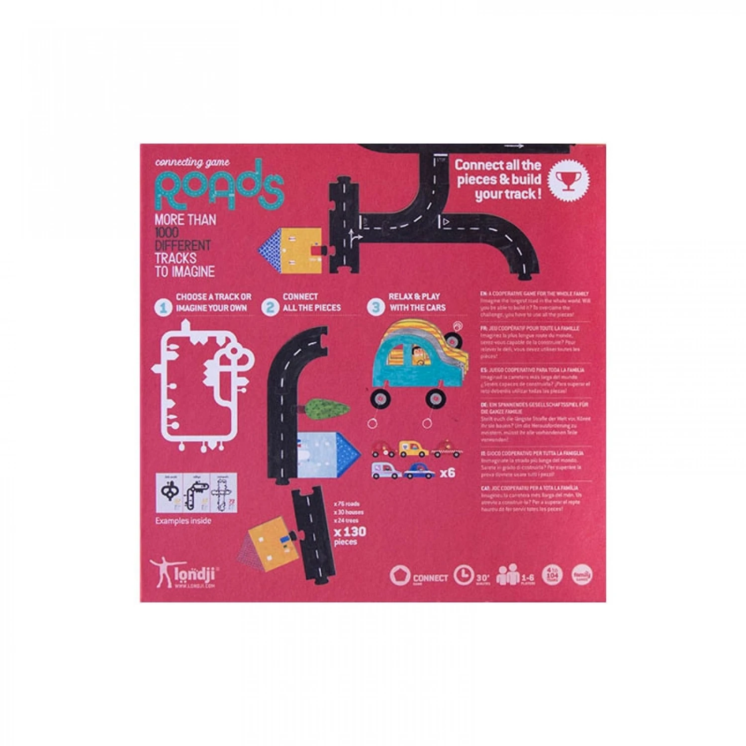 Contenu de la boîte : 6 voitures en carton, 76 routes, 30 maisons, 24 arbres, 1 livret avec 11 modèles de circuit