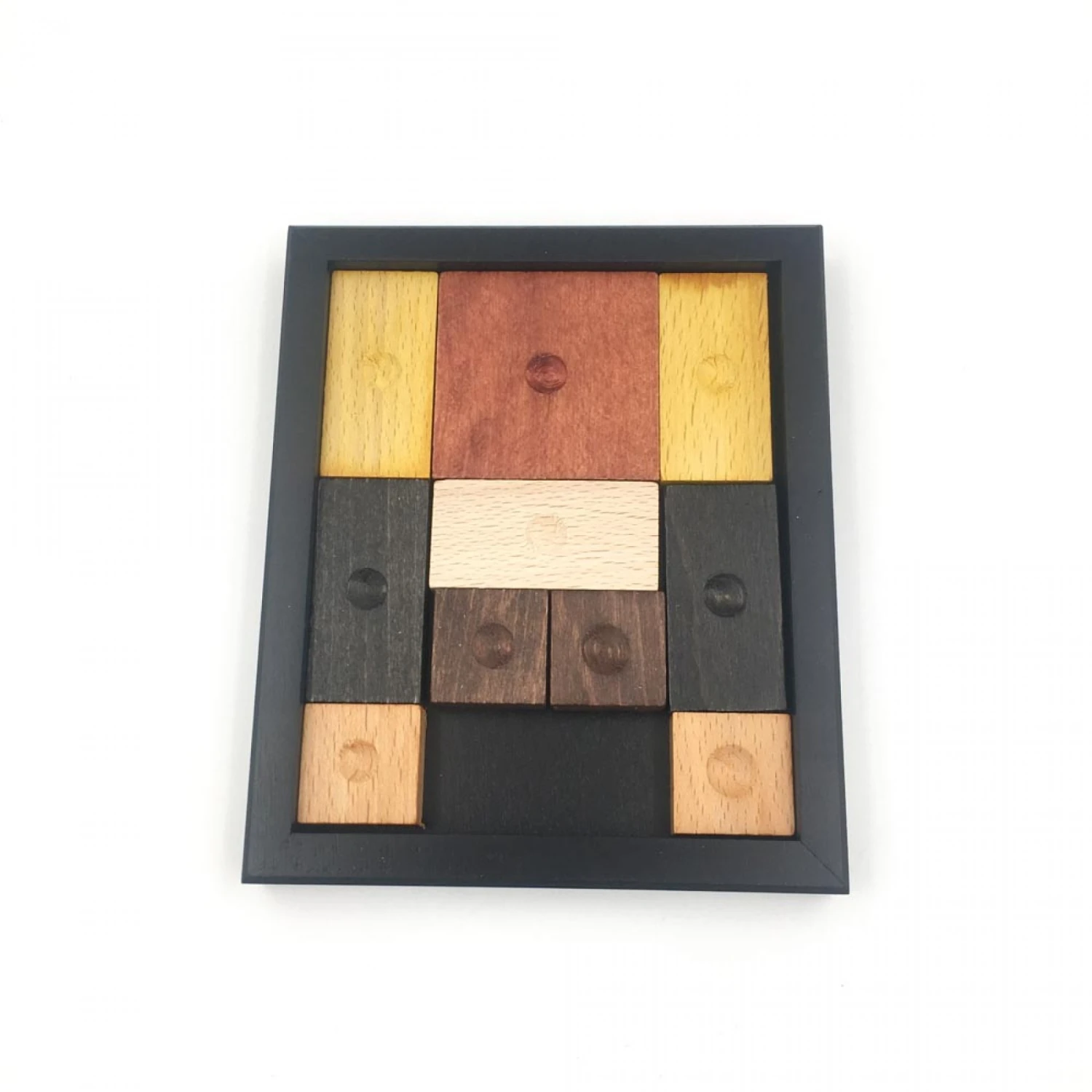 Règle du jeu : Prendre une carte et placer les pièces dans le cadre comme indiqué. A partir de cette position de départ, le joueur choisit un niveau de difficulté et un problème à réaliser. Il déplace les pièces horizontalement ou verticalement dans l’espace libre. Par glissements successifs, il doit sortir par l’ouverture du cadre la ou les 2 pièces choisies.