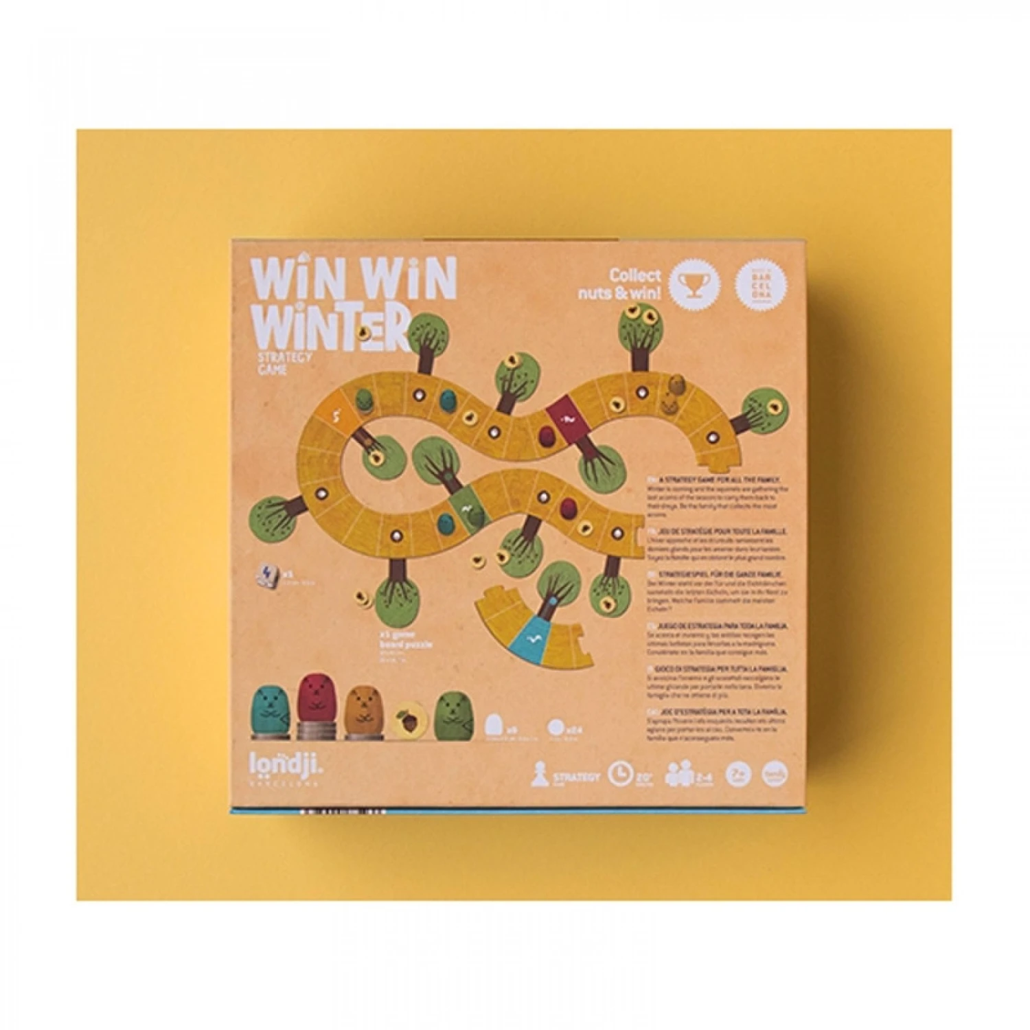 Règle du jeu : chaque joueur prend deux écureuils d’une même couleur. Les placer sur la case départ de sa couleur. Placez les pions glands sur les arbres. Le premier joueur lance le dé et déplace l’écureuil de son choix. Si l’écureuil porte un gland, il avancera moins vite. Les écureuils évoluent ensuite sur le plateau de jeu en fonction des cases sur lesquelles ils se trouvent. Le but du jeu est de rapporter un maximum de glands dans sa tanière.