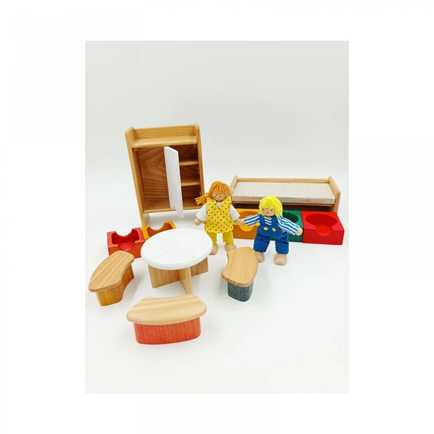 Equiper également d’autres pièces de la maison de poupée avec du mobilier en bois prévu pour : un salon, une salle de bain, une cuisine, une aire de jeux.