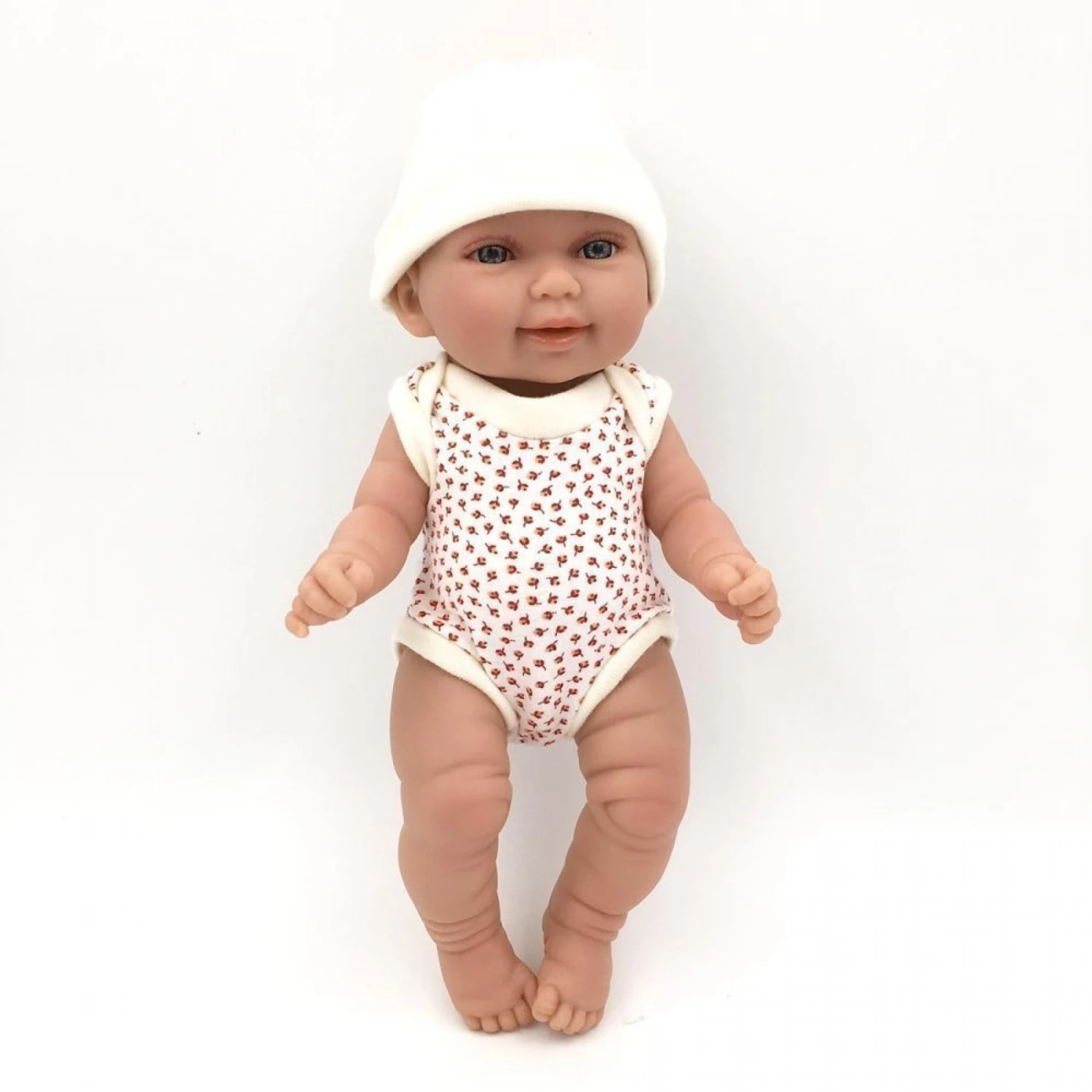 Micia est une poupée au visage souriant et expressif, au corps en vinyle, vêtue d’un body et d’un bonnet. Une poupée sexuée (sexe masculin).