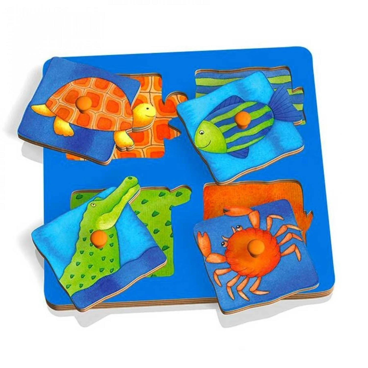 Un puzzle à encastrement comprenant 4 formes à encastrer sur le thème des animaux aquatiques. Retrouvez le pelage du crocodile, du poisson, crabe, tortue et placez-les correctement afin de reconstituer le puzzle. Un jeu en bois stimulant le développement de la motricité fine et la coordination.