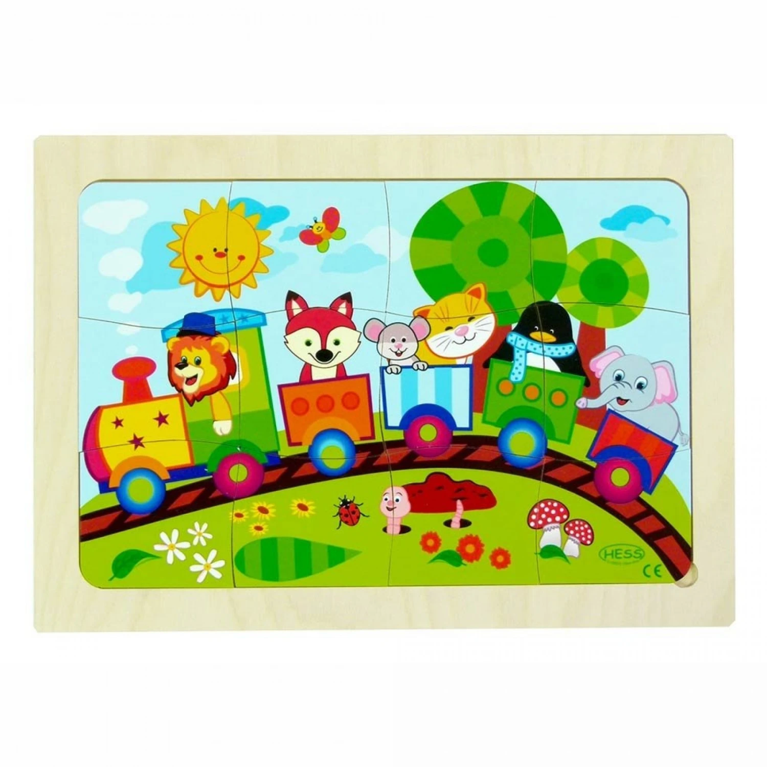 Un train qui traverse la campagne avec à son bord des animaux très joyeux. Ce puzzle de 12 pièces en bois très coloré est à reconstituer dans son cadre.