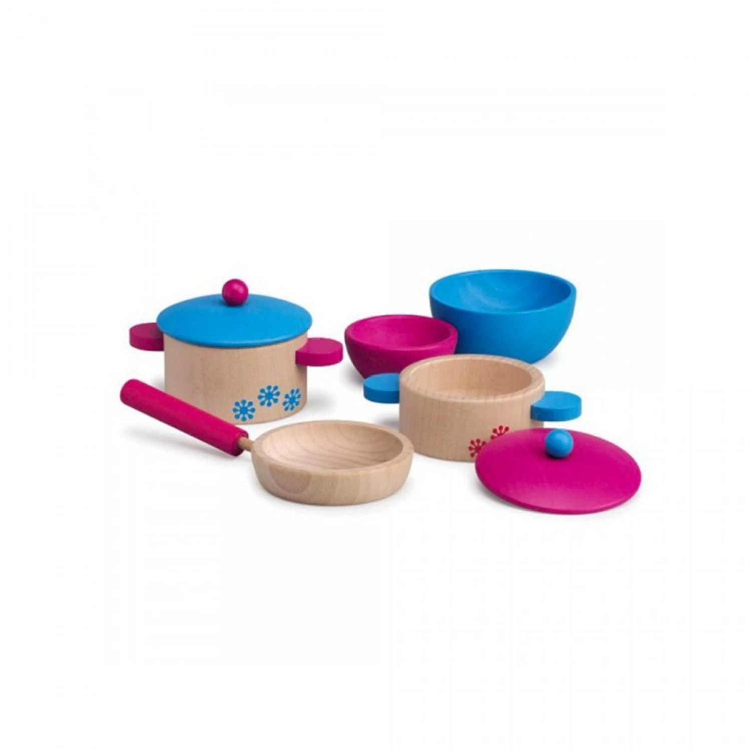 Un set contenant 2 casseroles et une poêle, pour jouer à la dînette et préparer de bons plats mijotés.