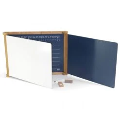 Un côté tableau noir pour écrire à la craie, un côté tableau blanc magnétique pour écrire au feutre et jouer avec des aimants, une fonction dessin au feutre sur papier.
